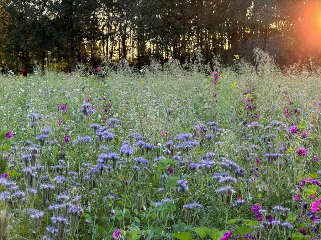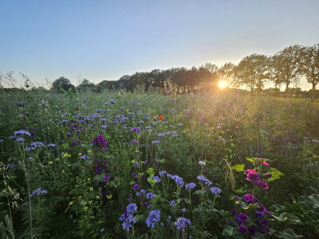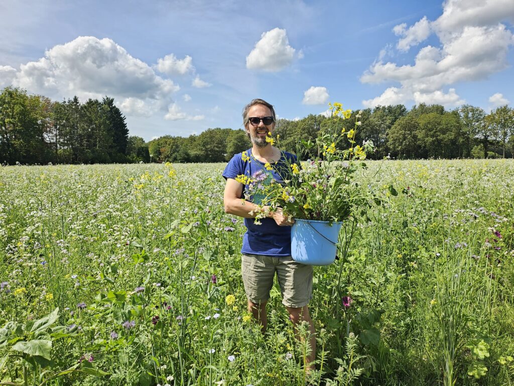 We maaien paadjes uit tussen de bloemen. Iedereen is hier welkom om er doorheen te wandelen. Het uitzicht vanaf het midden is fenomenaal. Werkelijk overal om je heen vliegt, zoemt en gonst het.